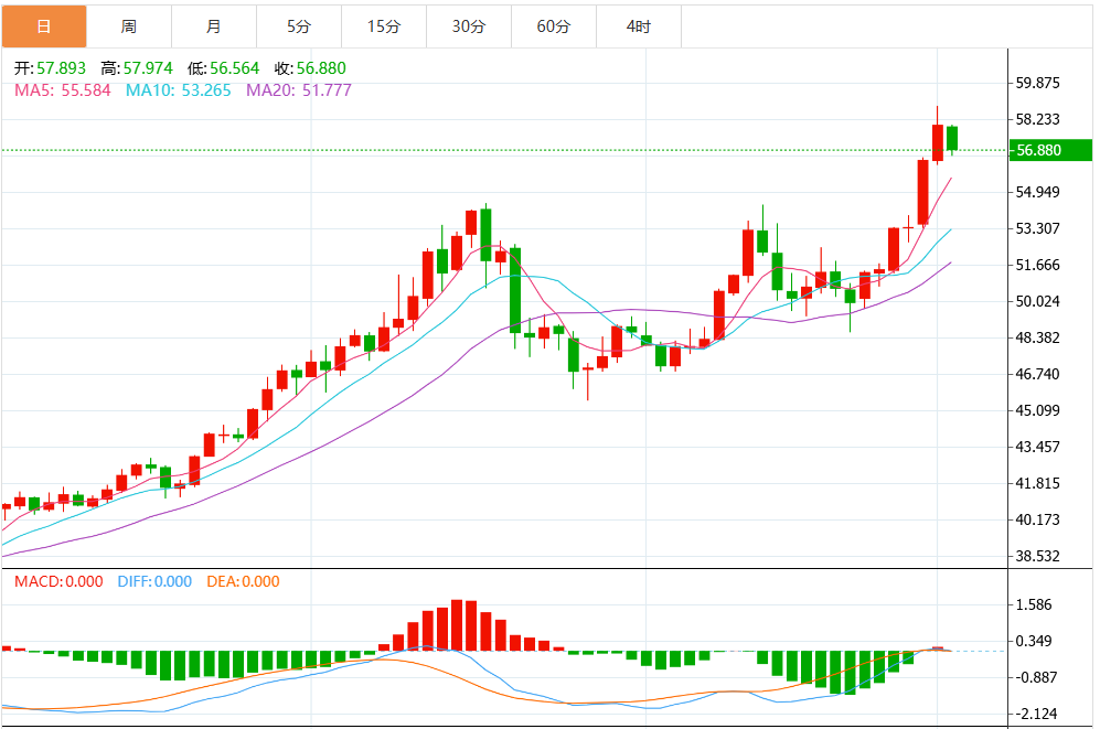 即时阻力位在11月中旬回调的161.8%回撤位,约在58.00美元。 若突破此位,下一个上行目标将是60.00美元的心理关口。 上述周期的261.8%斐波那契回撤位在63.80美元。