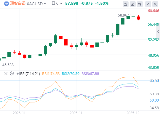 日线图中,白银报57.91美元。价格稳居上升的20天指数移动平均线53.61美元,保持短期上涨趋势。平均价稳步上涨,反映出持续的买入兴趣。RSI在71.61回撤后超买,可能因动能减弱而暂时受限。移动平均线支撑着下跌,预计下跌将吸引买家。