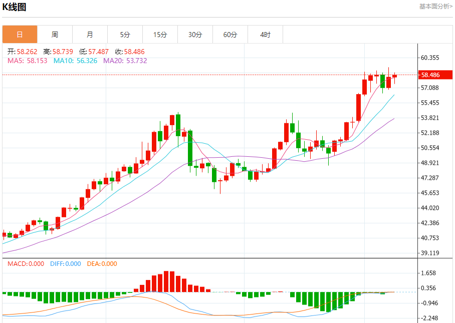 白银在56.58至59.34美元之间徘徊,持续一周多。20日指数移动平均线(EMA)正在上升,支撑了上涨,目前为54.73美元,价格稳稳守在上方。