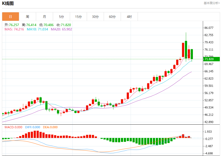 阻力位:第一阻力72.80美元/盎司(38.2%回撤位);第二阻力74.83美元/盎司(日线枢轴点第一阻力);强阻力79.06美元/盎司(日线枢轴点第二阻力)。