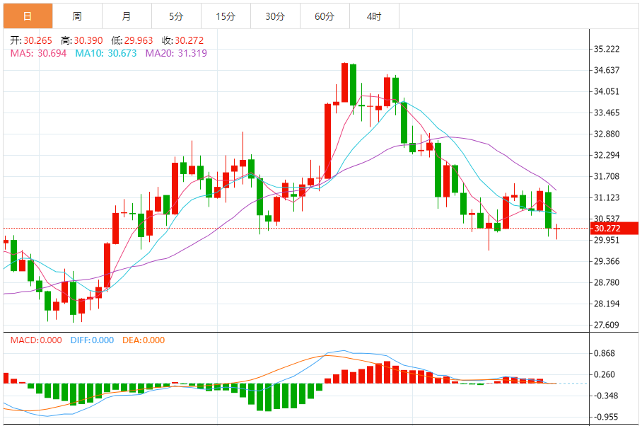 周一盘中,现货白银报30.385,跌幅0.74%。 今日分析:在30.50之下,看跌,目标价位为29.95,然后为29.65。 技术点评:跌破30.50,为空头信号,向下的目标将会是29.95。 支撑位:29.9529.6529.35 阻力位:30.8830.7030.50 (亚汇网编辑:冰凡)