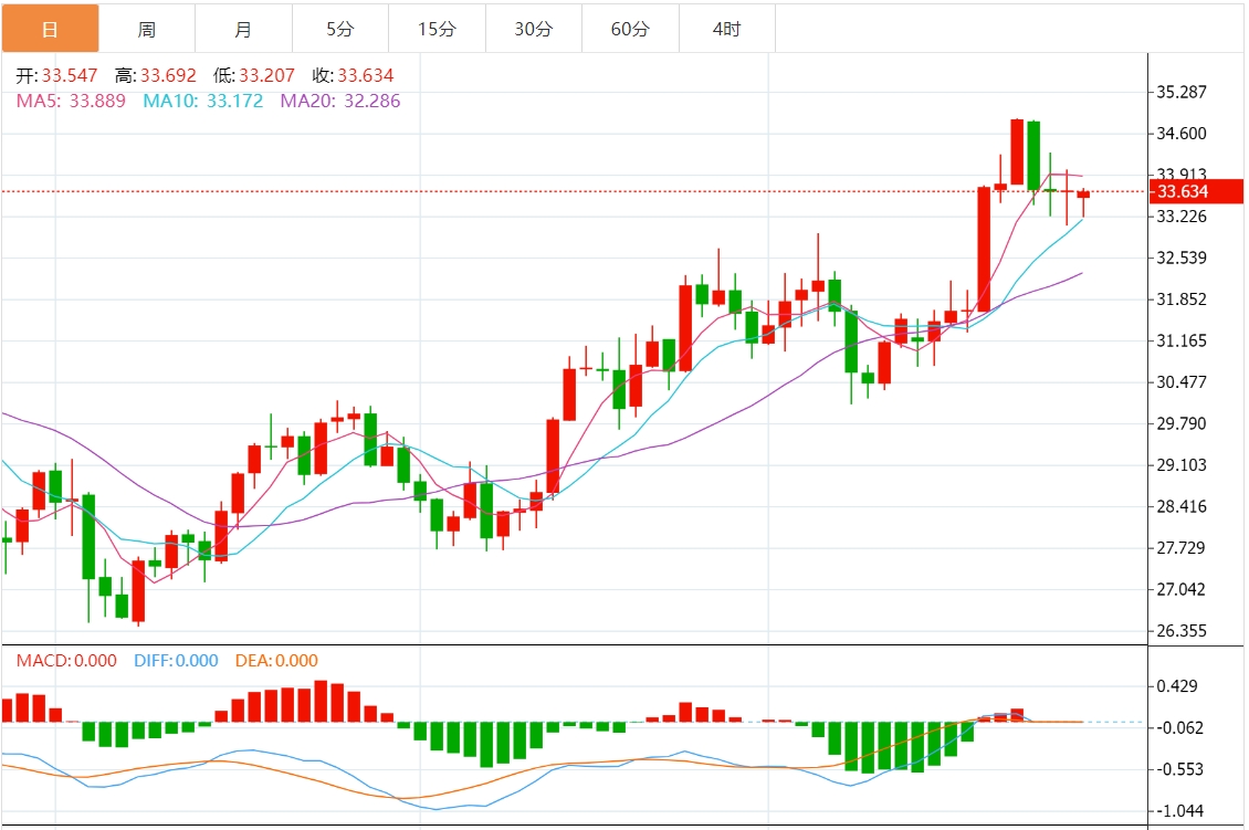 10月28日,周一欧市初盘,银价吸引了新卖盘,目前交投于33.30美元附近,全天下跌近1.25%。不过,银价仍维持在上周五创下的一周低点(33.10-33.00美元附近)上方,空头应谨慎行事。 白银技术分析 日图技术指标虽然一直在失去看涨动能,但仍保持在上涨区域。这进一步表明,谨慎的做法是,等待银价明确跌破33.00美元关口