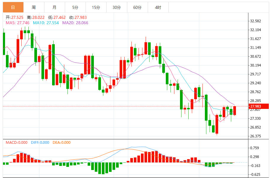 周四盘中,现货白银报28.322,涨幅2.82%。 今日分析:在27.75之上,看涨,目标价位为28.40,然后为28.65。 技术点评:其即时趋势维持向上,有较强的动能。 支撑位:27.7527.5027.35 阻力位:29.1528.6528.40 (亚汇网编辑:冰凡)