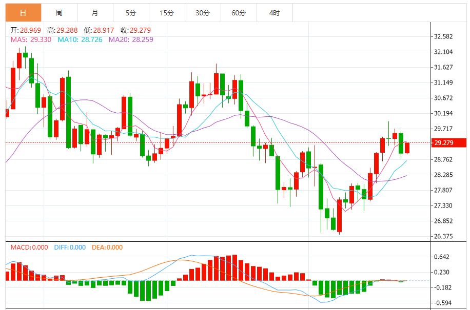 周三亚盘,白银重新获得积极牵引力,并阻止了隔夜从30.00美元心理关口附近或一个月高点的温和回调。这种白色金属目前的交易价格约为29.00美元左右,似乎准备延续其近期从本月早些时候触及的5月以来的最低水平的良好反弹。 白银技术走势分析 从技术角度来看,在29.20美元的汇合门槛断点附近出现逢低买入——包括50天
