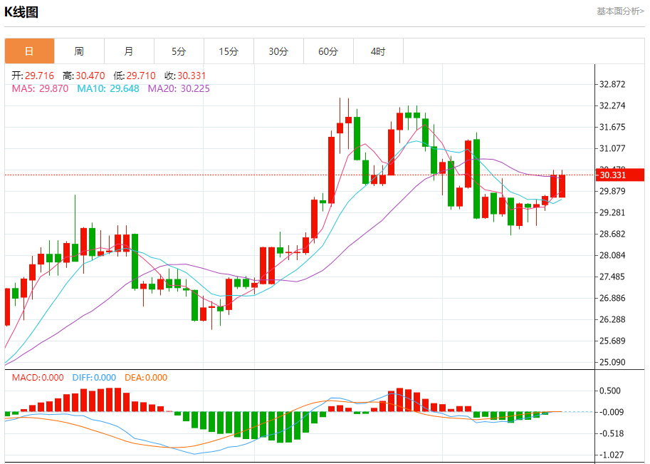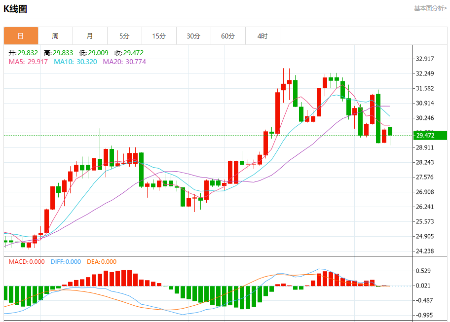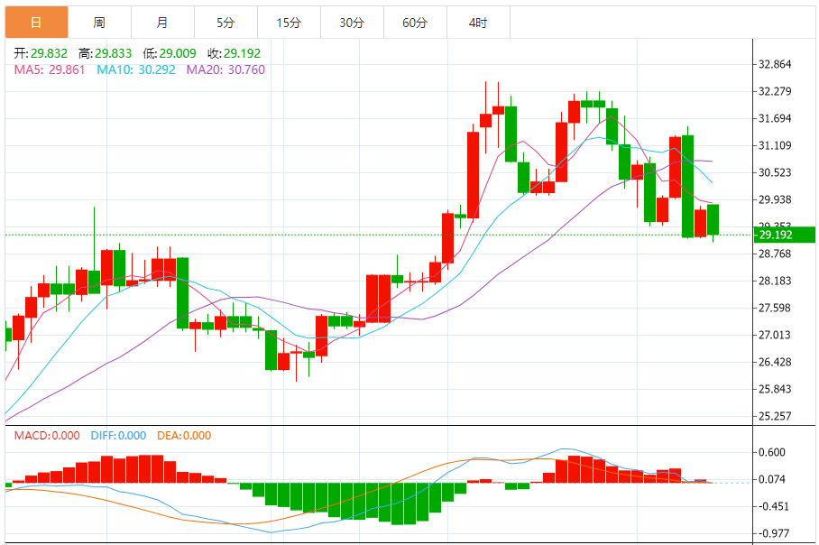 周一盘中,现货白银报29.224,跌幅1.04%。 今日分析:在29.37之下,看跌,目标价位为28.85,然后为28.65。 技术点评:跌破29.37,为空头信号,向下的目标将会是28.85。 支撑位:28.8528.6528.45 阻力位:29.7229.5729.37 (亚汇网编辑:冰凡)