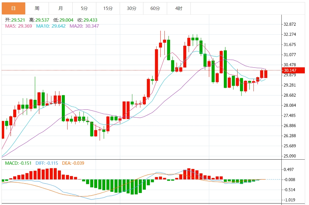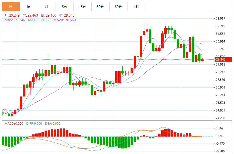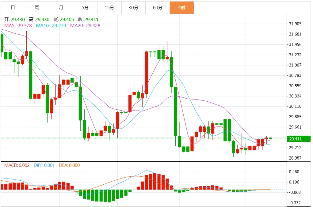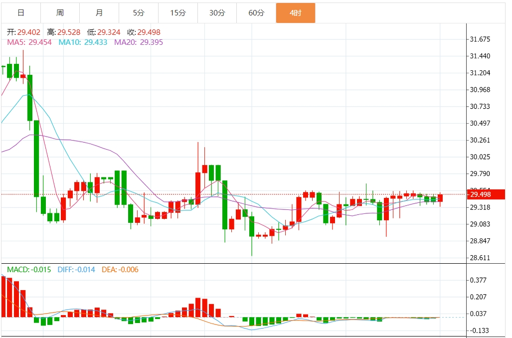 周三欧市盘前,尽管美元走强,但白银价格回升至29.40美元。然而,白金的上行空间可能受到美联储推迟降息的猜测的限制。在美国消费者物价指数(CI)和美联储利率决议发布之前,市场可能会在当天晚些时候变得谨慎。 白银技术走势分析 从技术上讲,白银在4小时图上保持看跌氛围不变,因为白色金属保持在关键的100周期