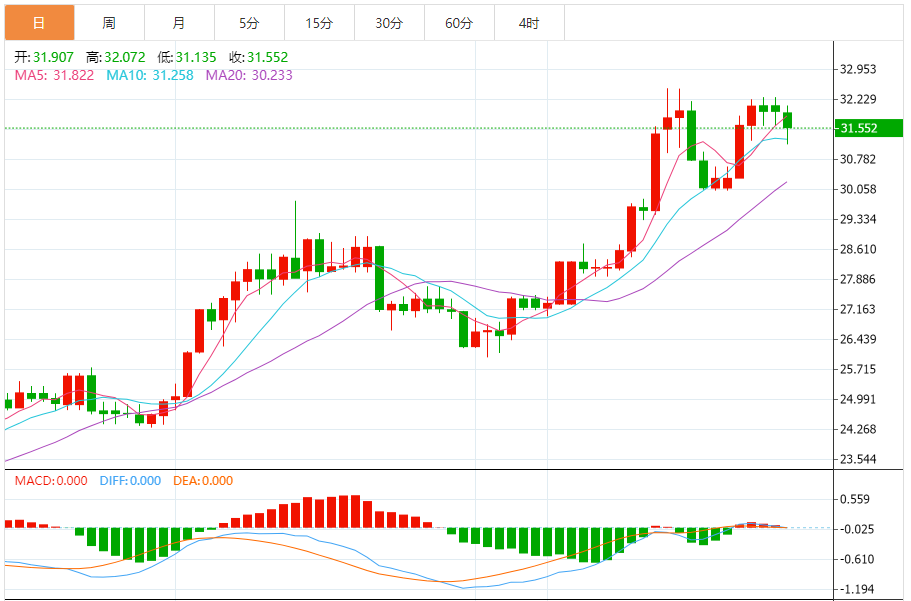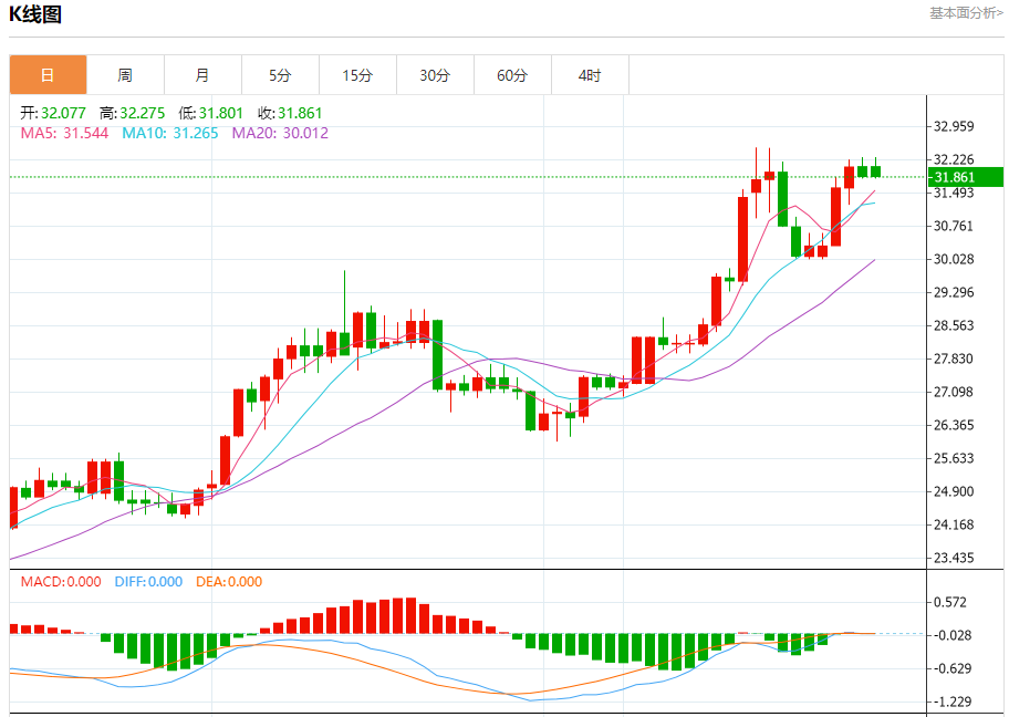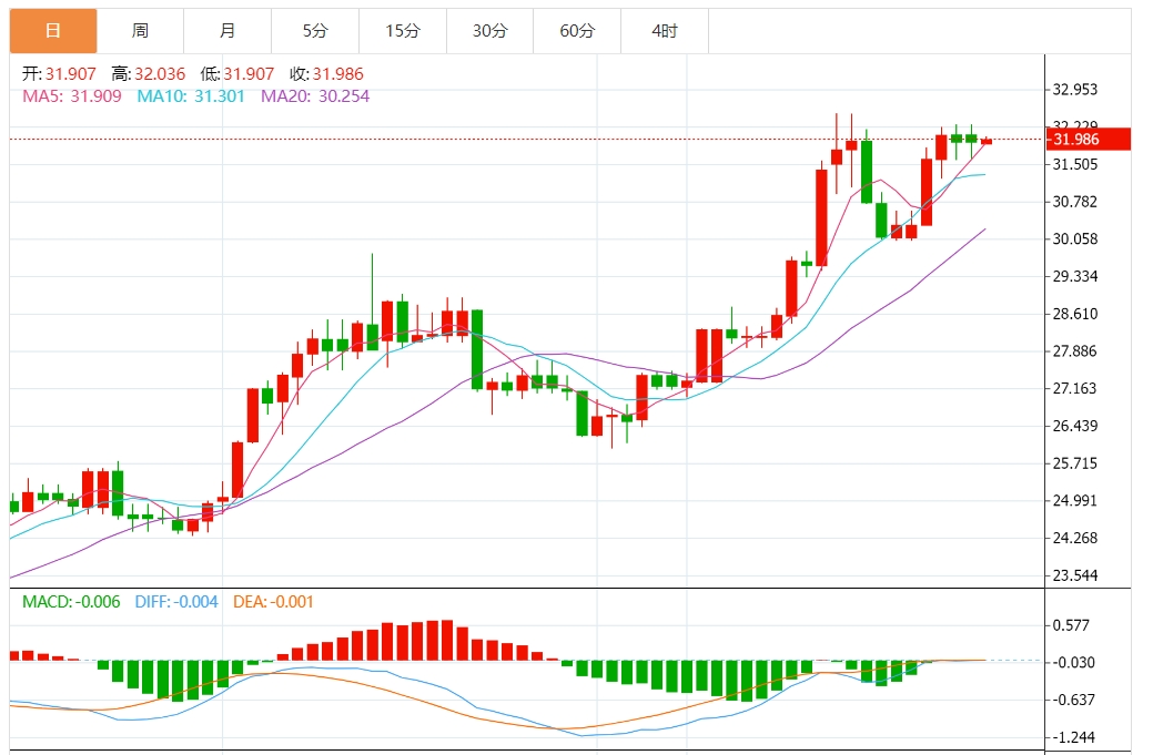 周四亚盘,由于美国国债收益率走高,贵金属承压下行,银价周三小幅下跌0.32%。因此,银价触及六日高点32.29美元后回落,亚市开盘后银价报31.97美元,几乎持平。 市场基本面分析 美元指数周三上涨0.49%,盘中最高触105.19,为5月14日以来新高,使得黄金对持有其他货币的投资者来说更加昂贵。明尼阿波利斯联储主席卡什卡