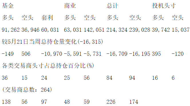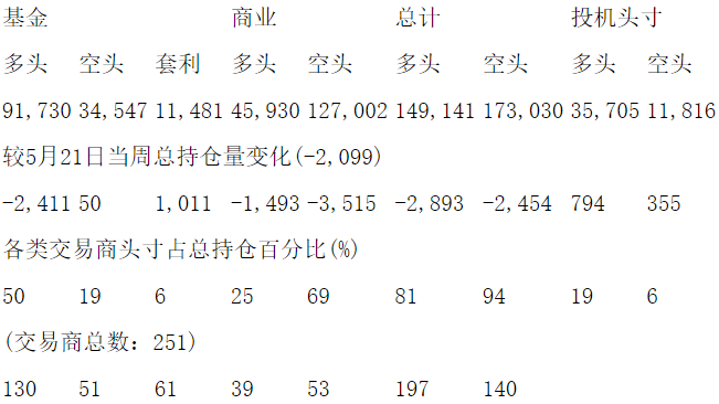 美国商品期货交易委员会(CFTC)最新公布截止5月28日当周COX白银期货和期权分类持仓报告: 合约单位:5000金衡盎司总持仓量:254066