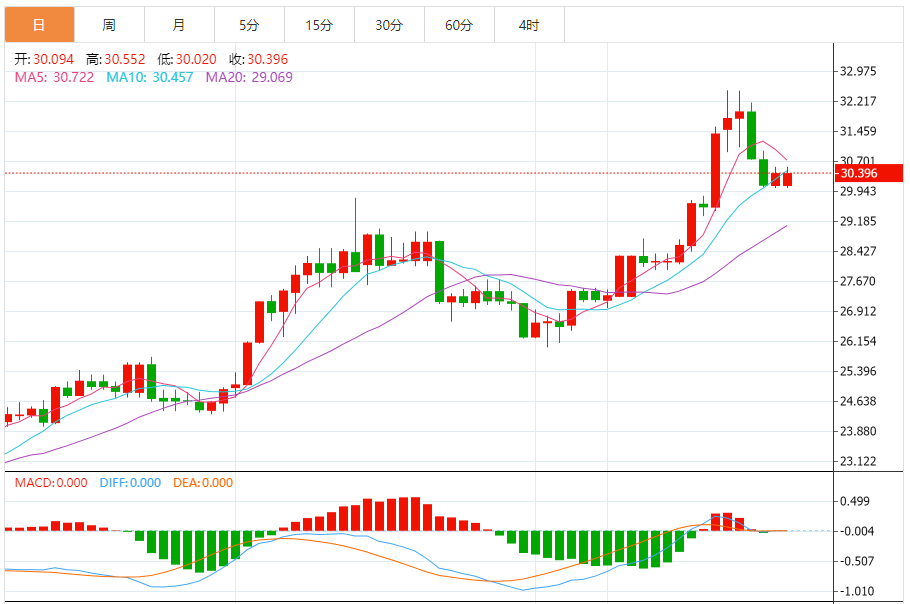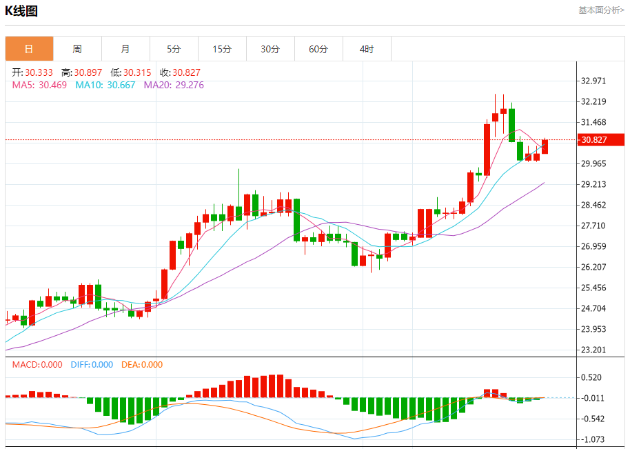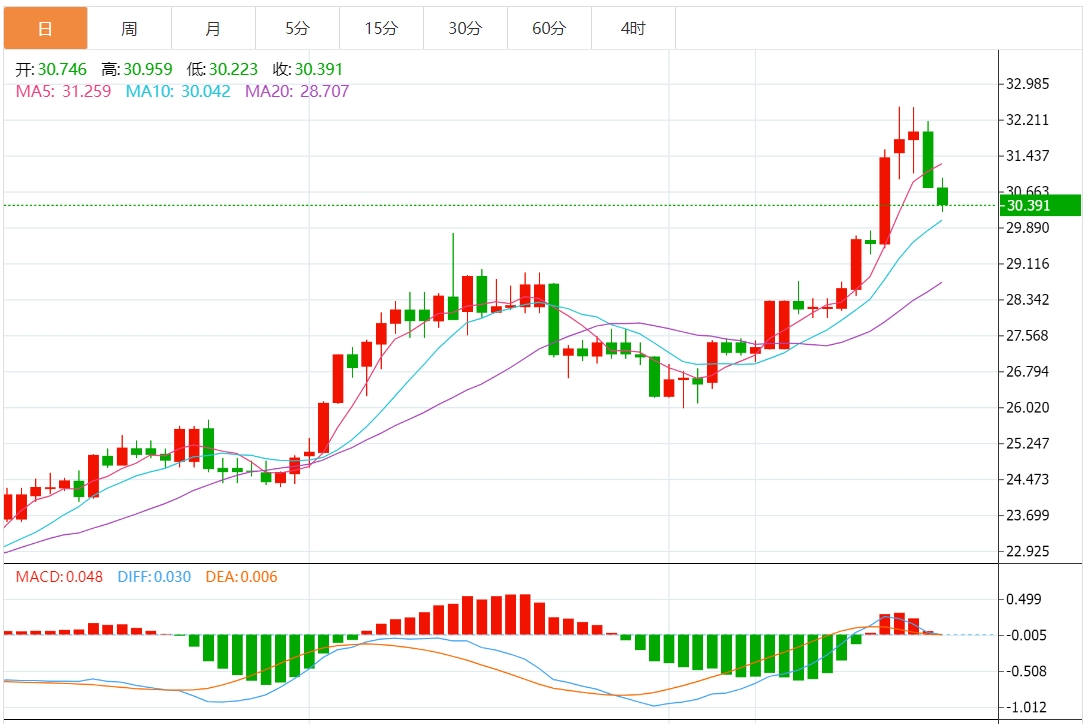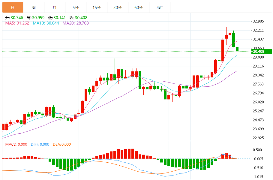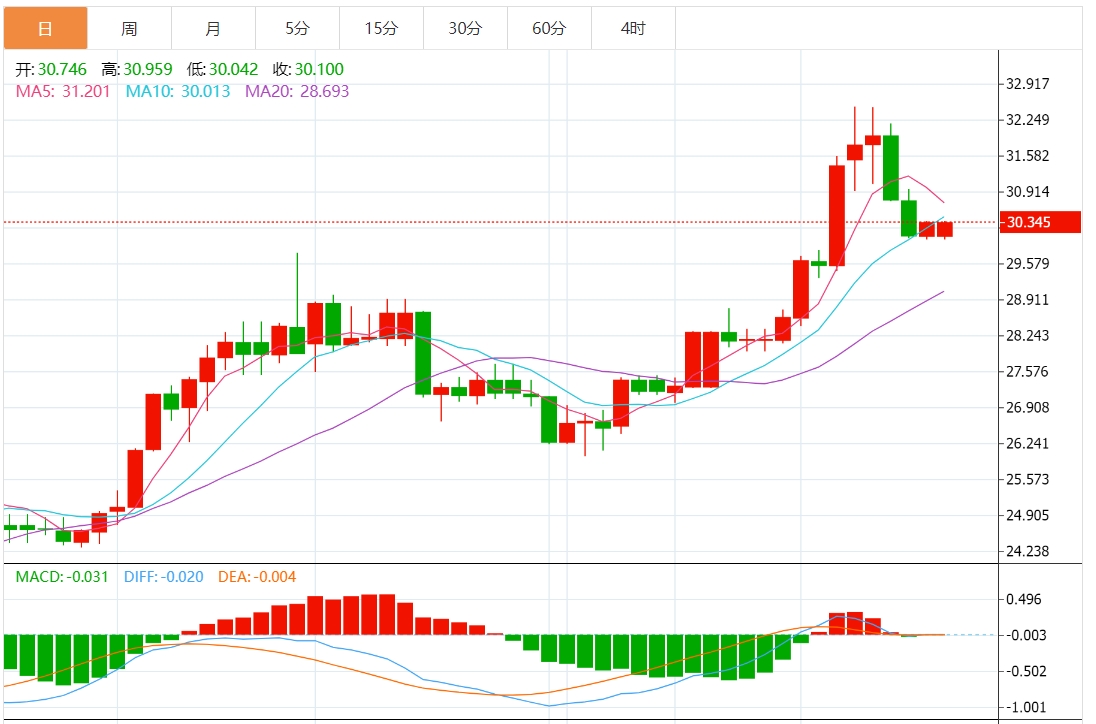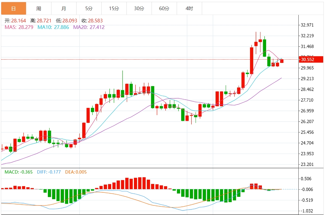 北京时间5月24日,欧式盘初,白银市场经历了连续两个交易日的大幅下跌后,迎来了温和的反弹。银价目前徘徊在30.35美元/盎司附近,市场参与者对此轮波动表现出浓厚的兴趣。本文将深入分析白银市场的最新动态,探讨其背后的逻辑,并预测未来的走势。 技术分析:银价的未来走向 现货白银在连续两日的暴跌之后,市场出现了