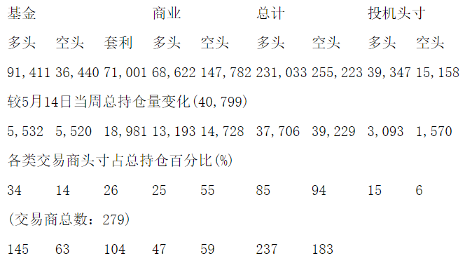 美国商品期货交易委员会(CFTC)最新公布截止5月21日当周COX白银期货和期权分类持仓报告: 合约单位:5000金衡盎司总持仓量:270380
