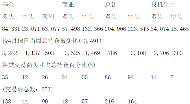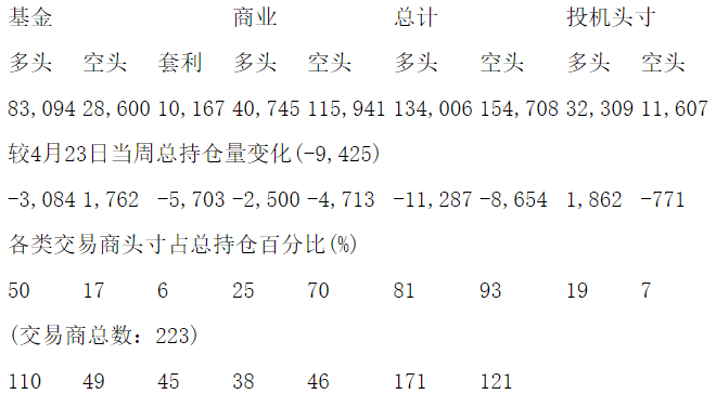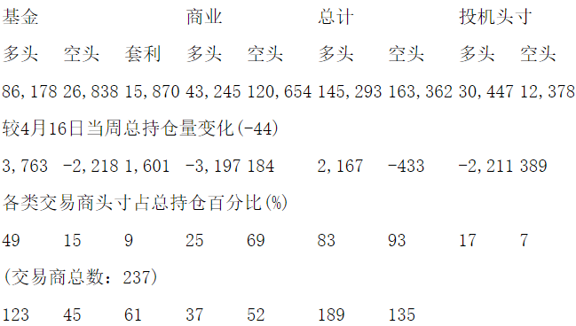 美国商品期货交易委员会(CFTC)最新公布截止4月23日当周COX白银期货分类持仓报告: 合约单位:5000金衡盎司总持仓量:175740