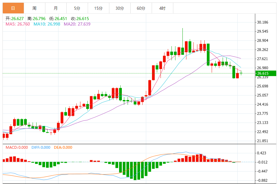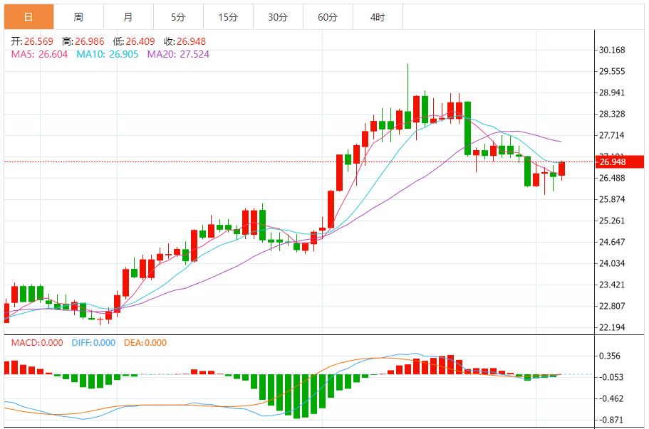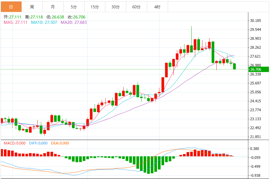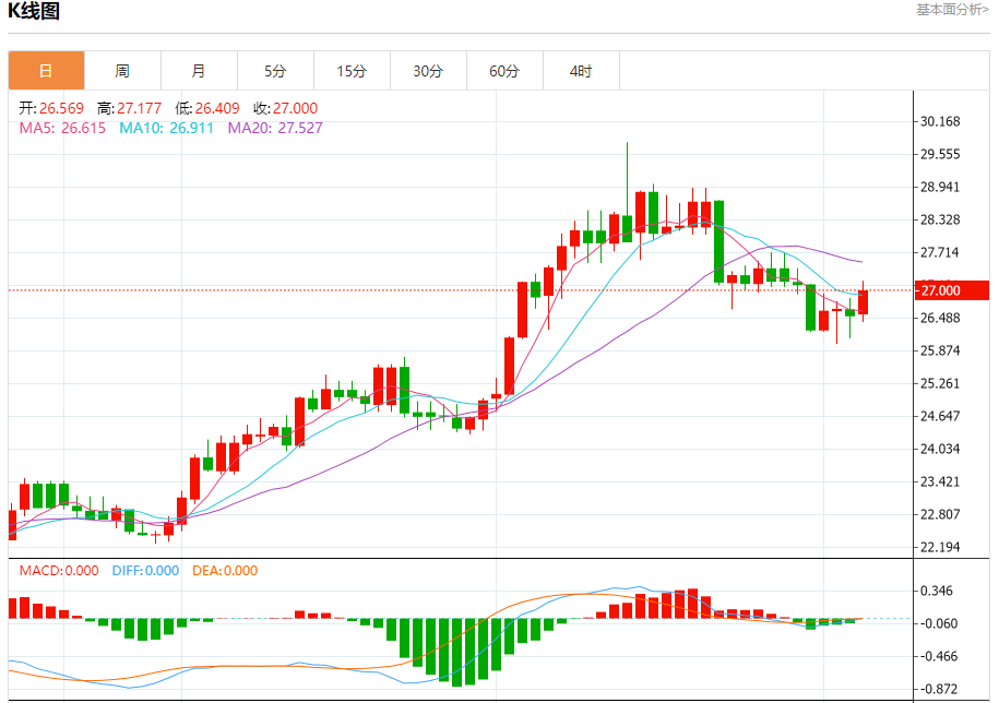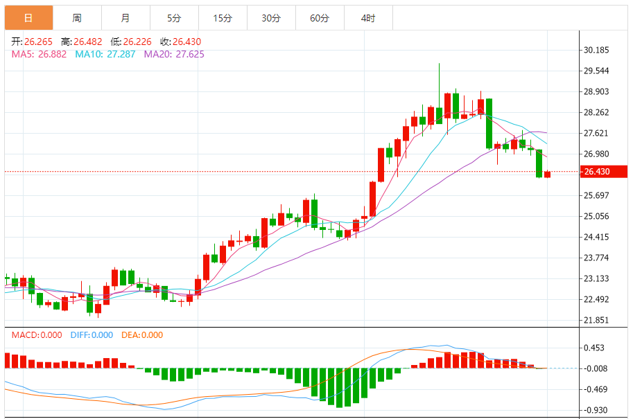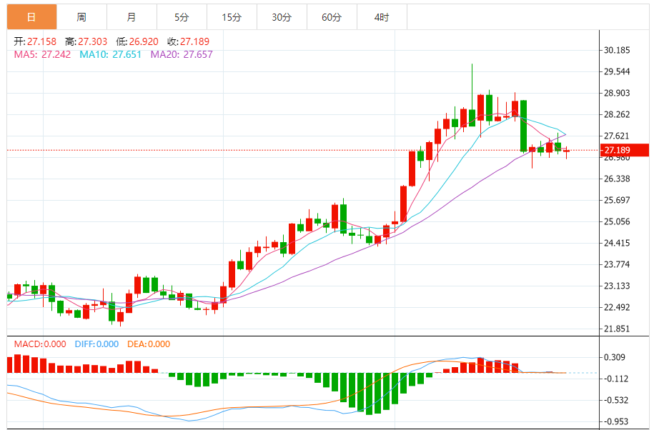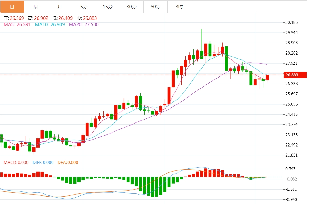 周四(5月2日),现货白银目前位于26.613美元/盎司,跌幅为0.02%。白银价格昨天提供了积极的交易,测试了26.90美元的水平,并从那里反弹看跌。今天,它开始了看跌倾向,并朝着恢复看跌修正,目标测试26.00美元作为下一站。突破它将把价格推向25.15美元作为下一个修正目标。 因此,在价格稳定在26.90美元以下的条