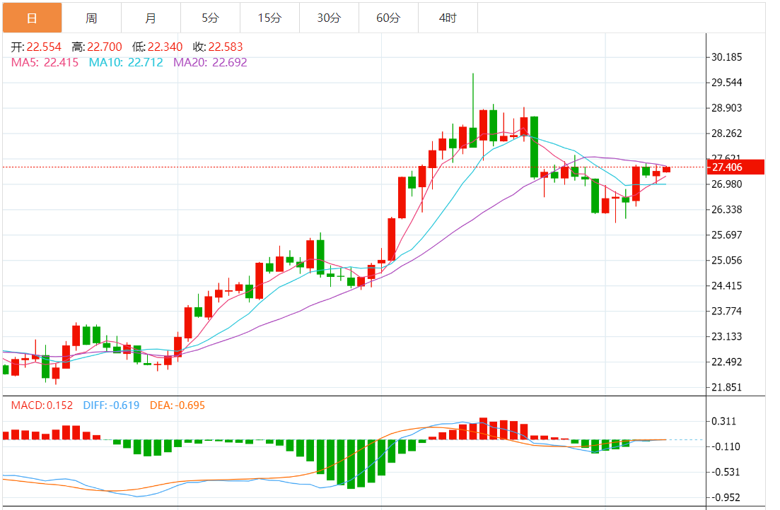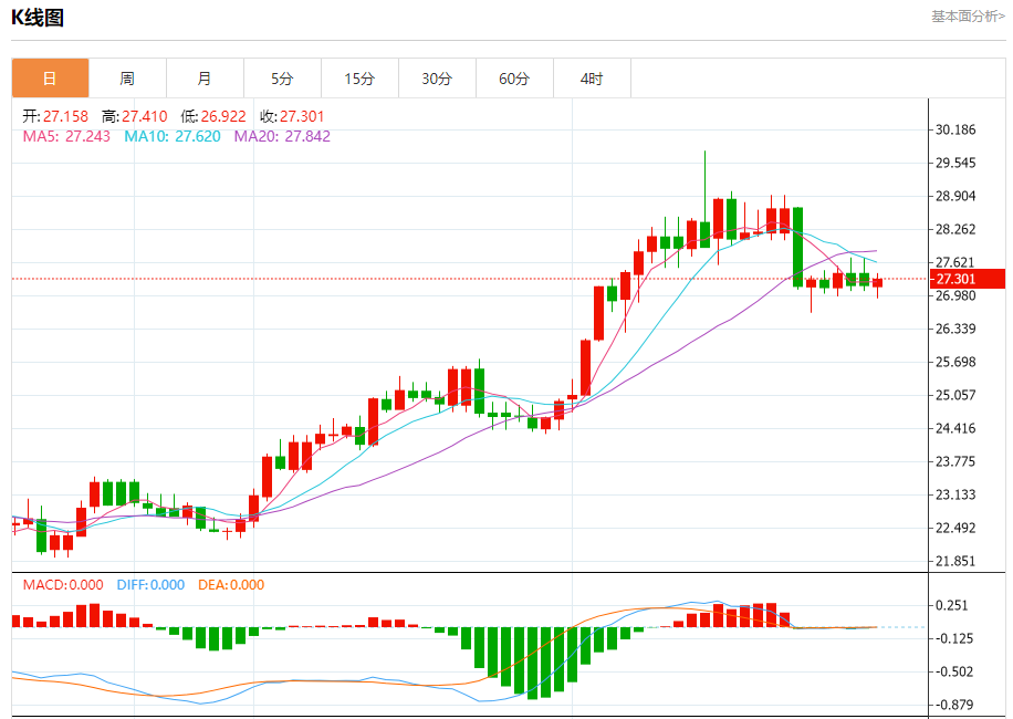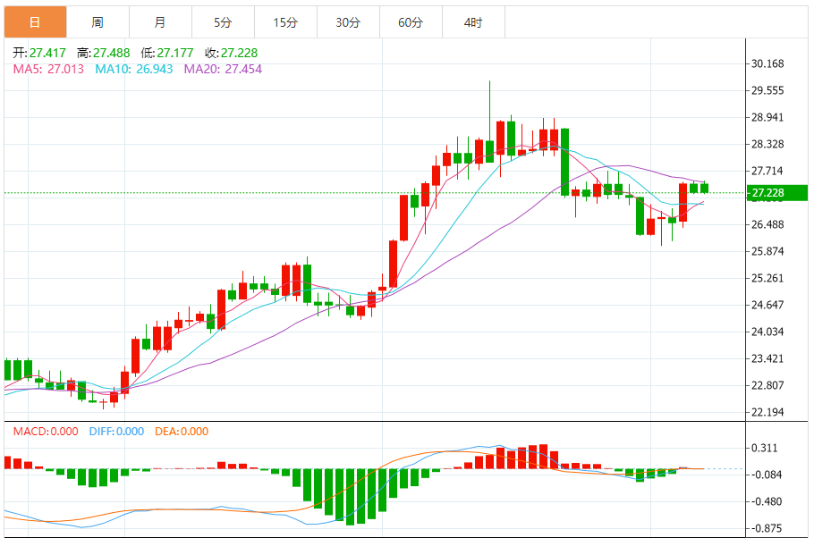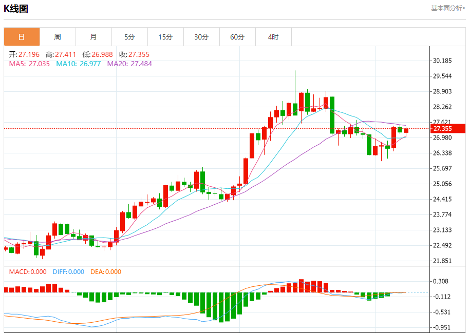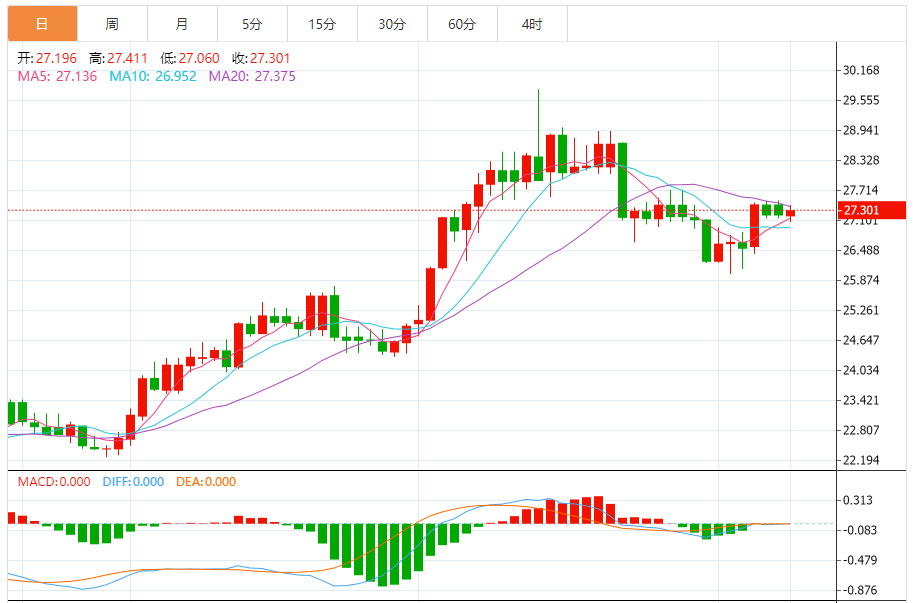 周三盘中,现货白银报27.295,涨幅0.34%。 今日分析:在27.52之下,看跌,目标价位为27.00,然后为26.82。 技术点评:RI技术指标运行趋势复杂,倾向于下跌。 支撑位:27.0026.8226.62 阻力位:27.9027.7227.52 (亚汇网编辑:冰凡)