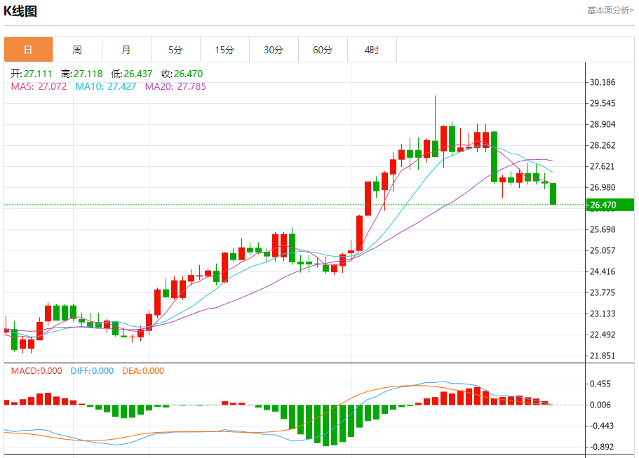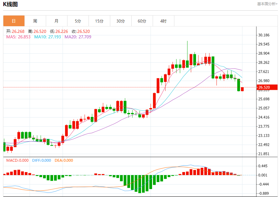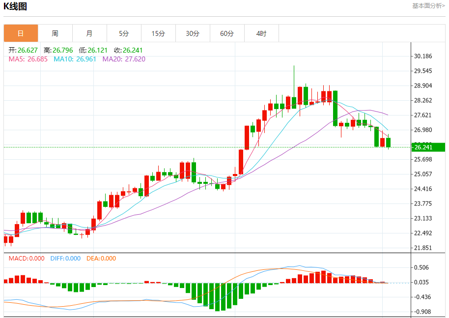 周四盘中,现货白银报26.293,跌幅1.22%。 今日分析:在26.55之下,看跌,目标价位为26.13,然后为26.00。 技术点评:跌破26.55,为空头信号,向下的目标将会是26.13。 支撑位:26.1326.0025.75 阻力位:26.8226.6926.55 (亚汇网编辑:冰凡)