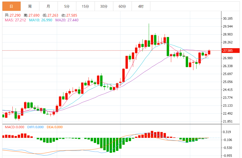 周四盘中,现货白银报27.690,涨幅1.40%。 今日分析:在27.40之上,看涨,目标价位为27.72,然后为27.90。 技术点评:在27.40之上,为多头信号,向上的目标位为27.72。 支撑位:27.4027.2627.14 阻力位:28.0527.9027.72 (亚汇网编辑:冰凡)