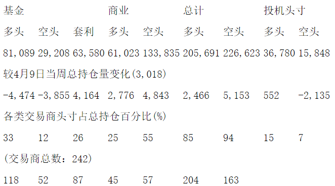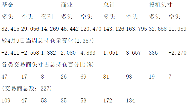 美国商品期货交易委员会(CFTC)最新公布截止4月16日当周COX白银期货分类持仓报告: 合约单位:5000金衡盎司总持仓量:175784