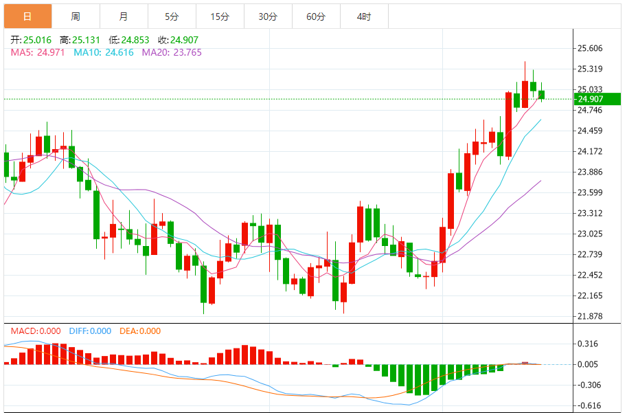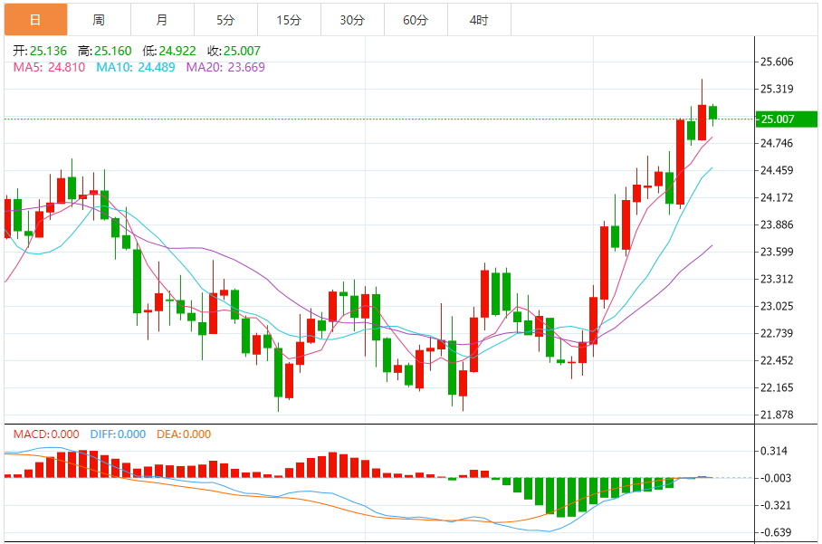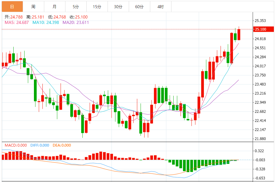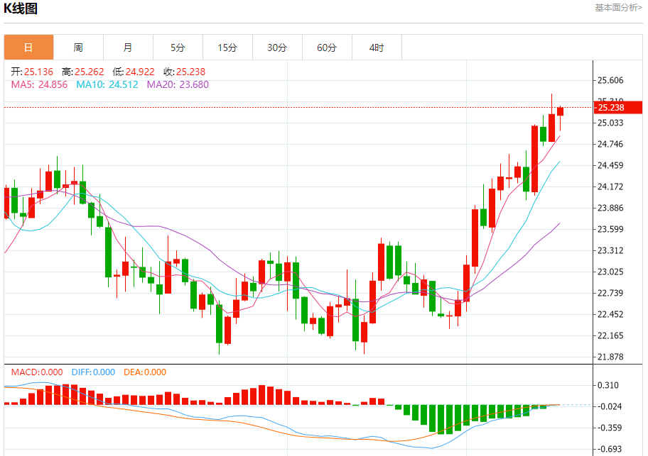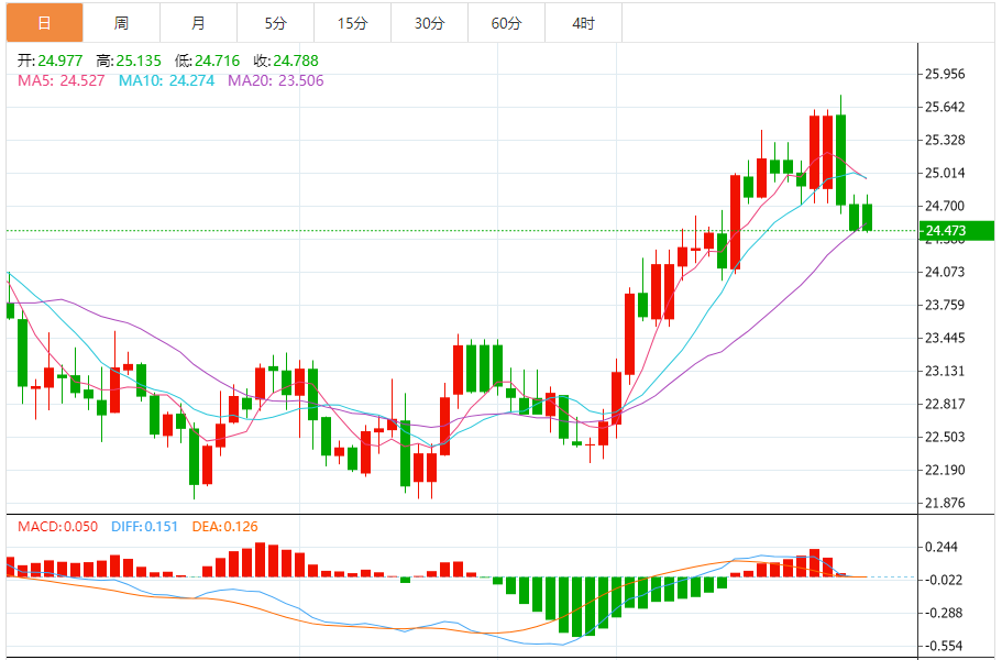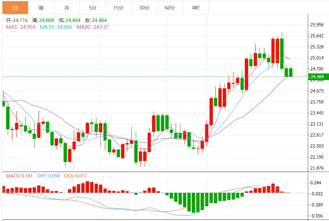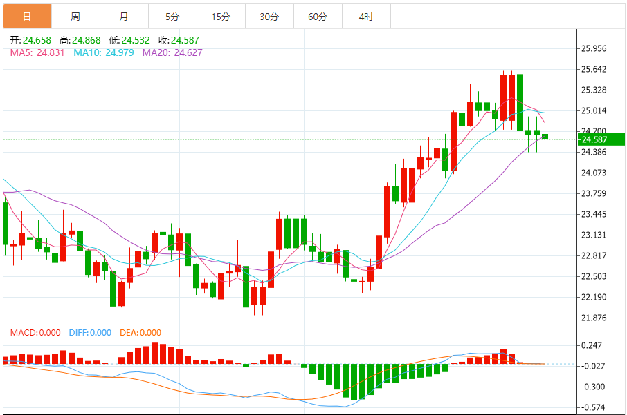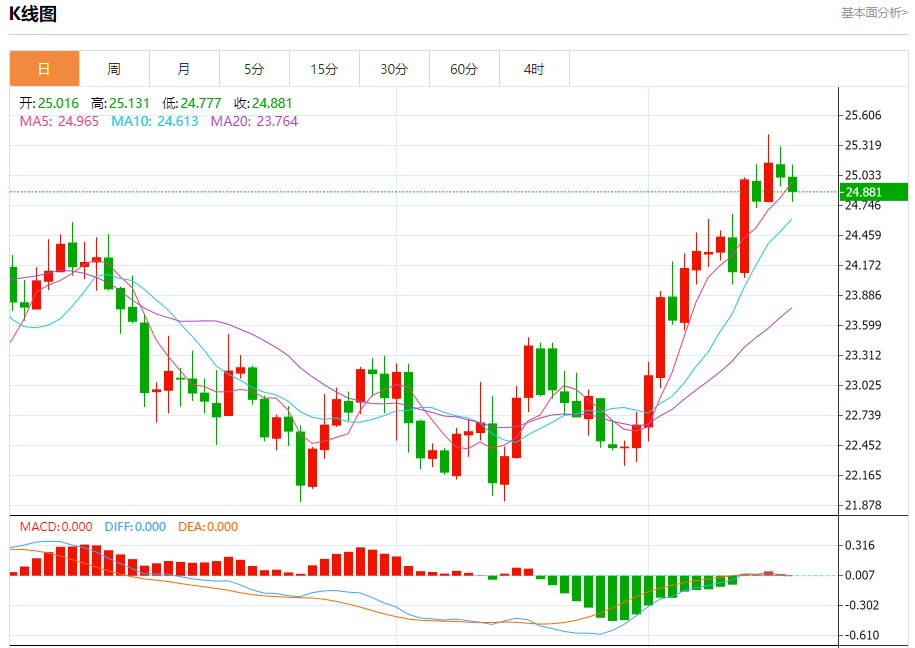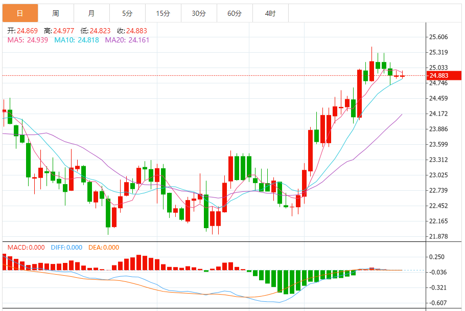 周一(3月25日),现货白银目前位于24.588美元/盎司,跌幅为0.25%。白银价格试图突破24.60美元的水平,但它保持稳定在此之上,以保持看涨趋势在即将到来的时期活跃,等待获得积极的动机,帮助推动价格达到我们等待的第一个目标25.50美元。 突破24.90美元将使上涨变得容易,突破目标水平将使牛市延长至26.07美元,