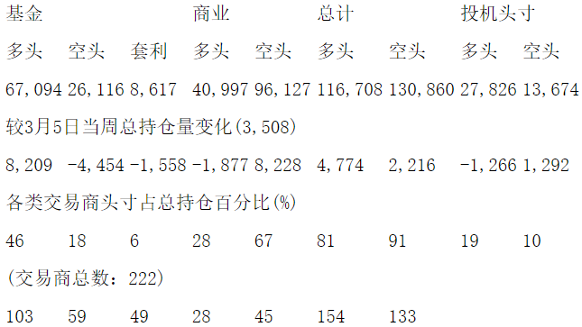 美国商品期货交易委员会(CFTC)最新公布截止3月12日当周COX白银期货和期权分类持仓报告: 合约单位:5000金衡盎司总持仓量:175805