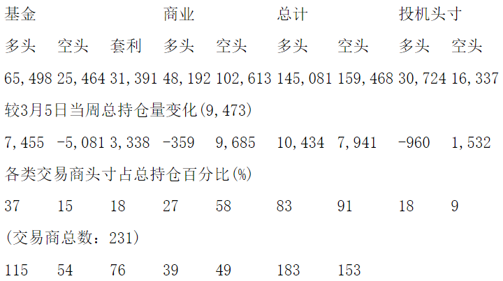 美国商品期货交易委员会(CFTC)最新公布截止3月12日当周COX白银期货分类持仓报告: 合约单位:5000金衡盎司总持仓量:144534