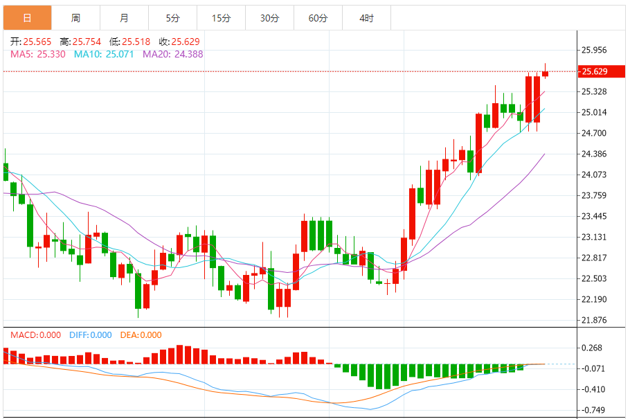 周四(3月21日),现货白银目前位于25.629美元/盎司,涨幅为0.29%。白银价格成功实现了我们等待的25.50美元的目标,今天开盘时进一步上涨超过这一水平,并确认了看涨趋势的延续,为下一站26.07美元开辟了道路。 因此,我们将继续建议未来一段时间的看涨趋势,突破最后一个水平将导致价格实现达到26.90美元的额外