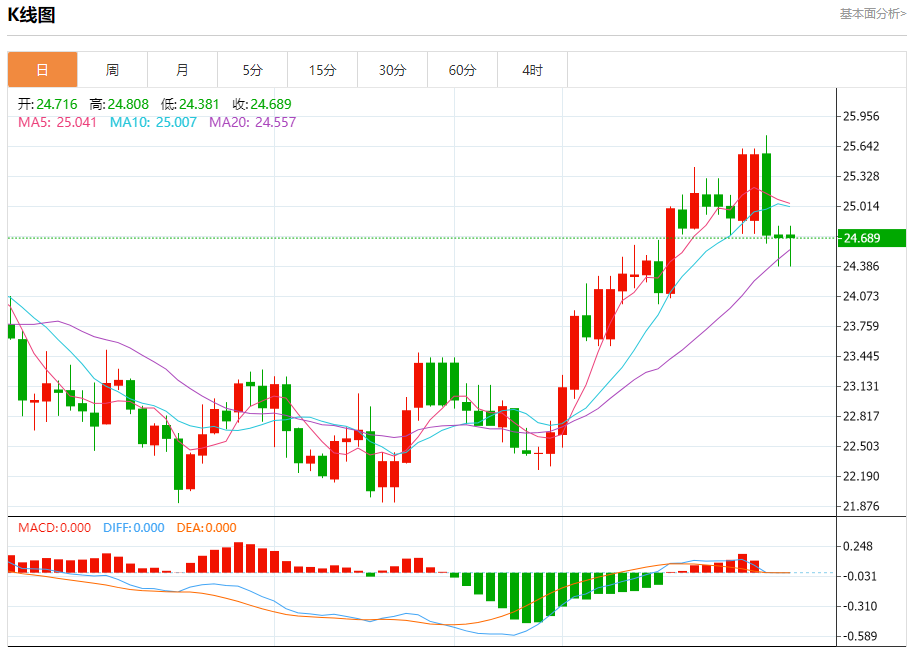 周四盘中,现货白银报24.952,跌幅0.16%。 今日分析:在24.65之上,看涨,目标价位为25.15,然后为25.35。 技术点评:RI技术指标运行趋势复杂,倾向于上升。 支撑位:24.6524.4024.25 阻力位:25.5025.3525.15 (亚汇网编辑:冰凡)