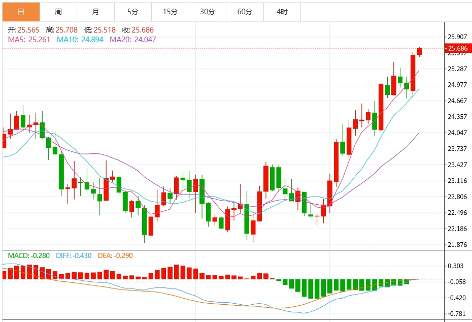 周四盘中,现货白银报25.413,跌幅0.56%。 今日分析:在25.37之上,看涨,目标价位为25.90,然后为26.15。 技术点评:25.37附近形成了一个支撑的底部,将带来走势短期内的稳定。 支撑位:25.3725.1224.95 阻力位:26.4026.1525.90 (亚汇网编辑:冰凡)