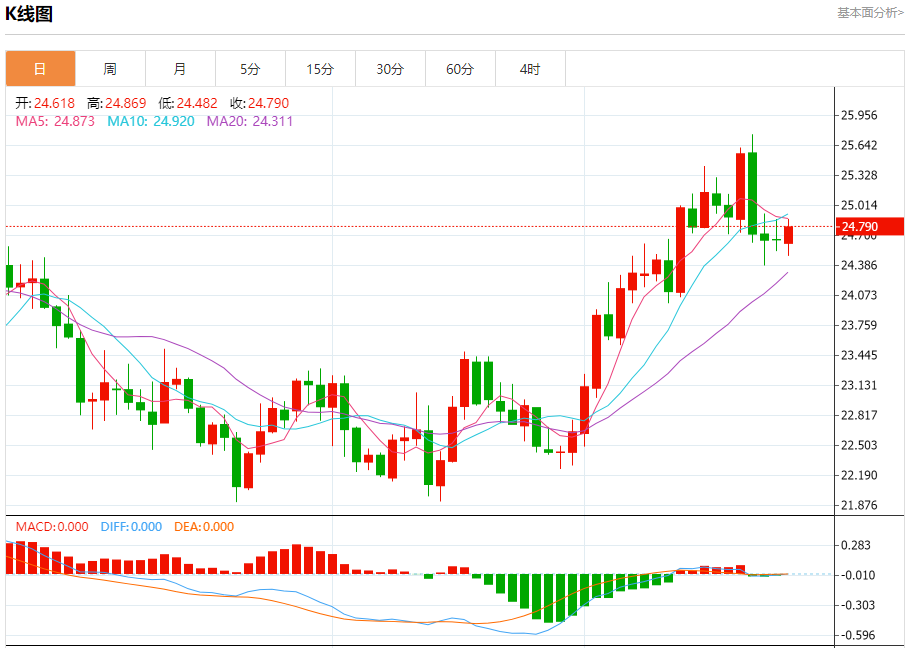 周五盘中,现货白银报24.658,跌幅0.23%。 今日分析:在24.70之下,看跌,目标价位为24.30,然后为24.00。 技术点评:跌破24.70,为空头信号,向下的目标将会是24.30。 支撑位:24.3024.0023.80 阻力位:25.0524.8524.70 (亚汇网编辑:冰凡)