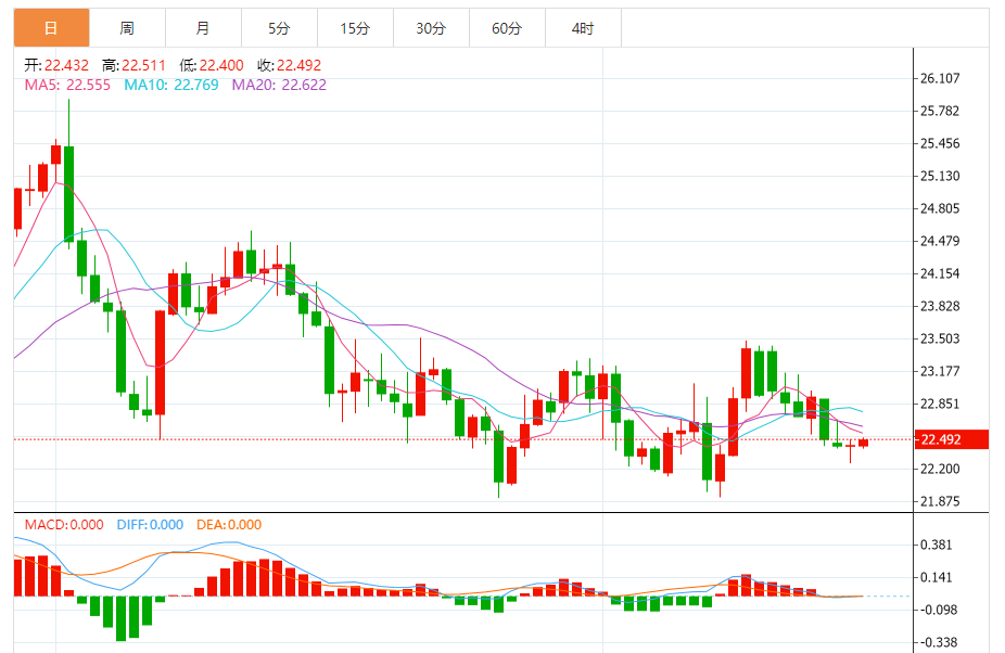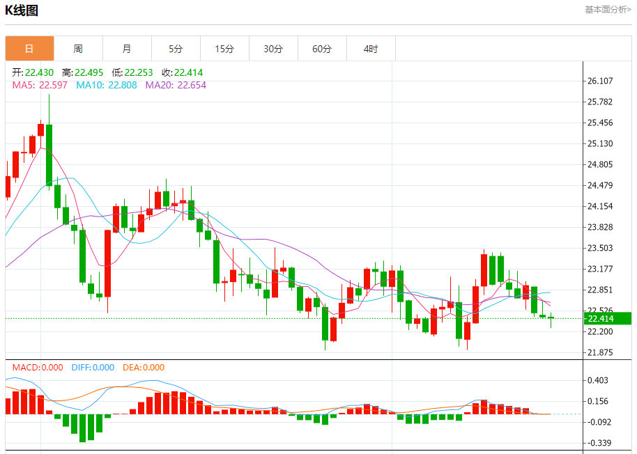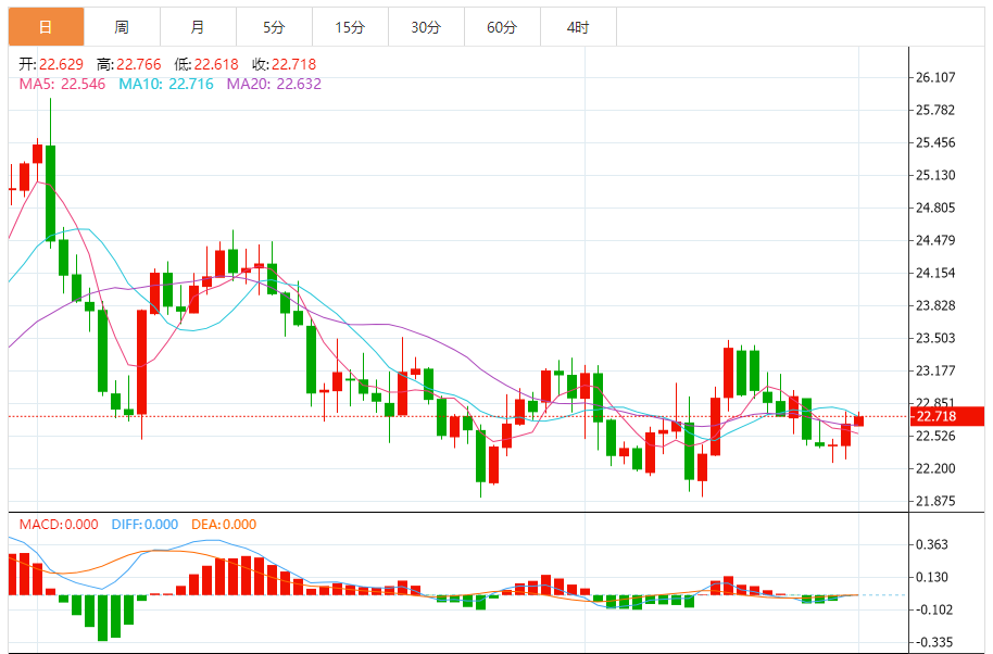 周四盘中,现货白银报22.341,跌幅0.42%。 今日分析:在22.45之下,看跌,目标价位为22.25,然后为22.16。 技术点评:跌破22.45,为空头信号,向下的目标将会是22.25。 支撑位:22.2522.1622.05 阻力位:22.7122.5622.45 (亚汇网编辑:冰凡)