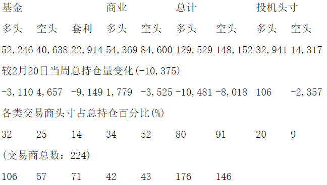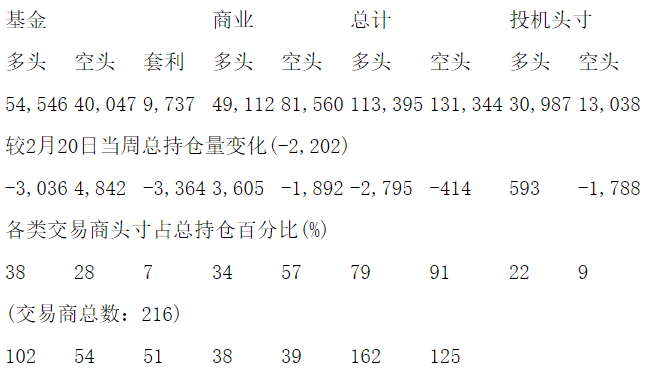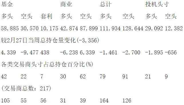 美国商品期货交易委员会(CFTC)最新公布截止2月27日当周COX白银期货分类持仓报告: 合约单位:5000金衡盎司总持仓量:144382