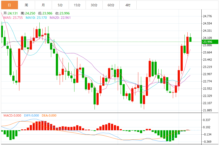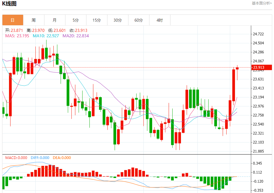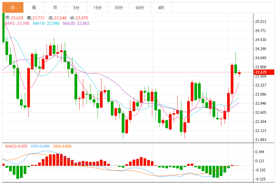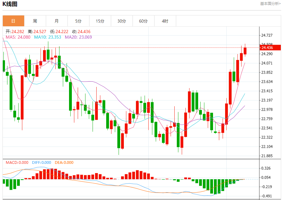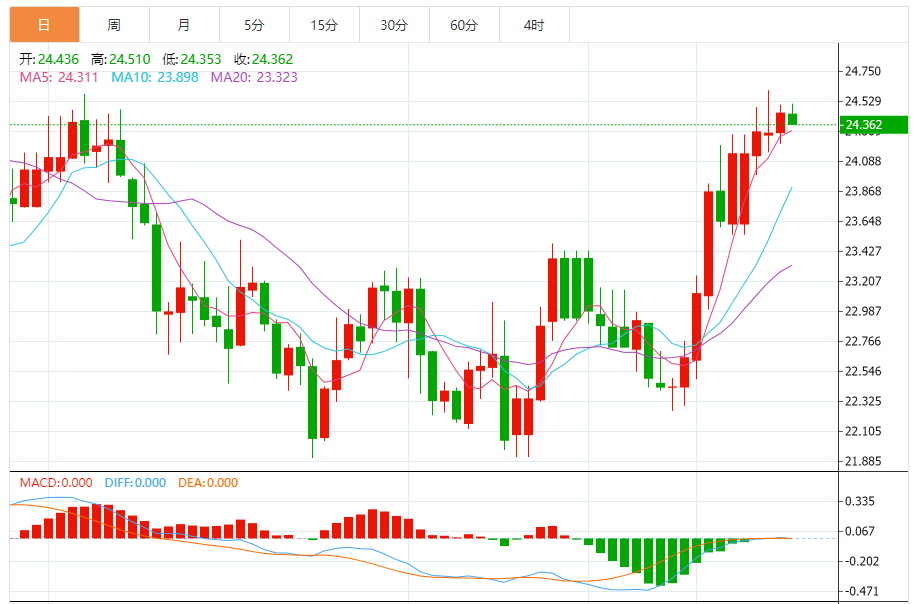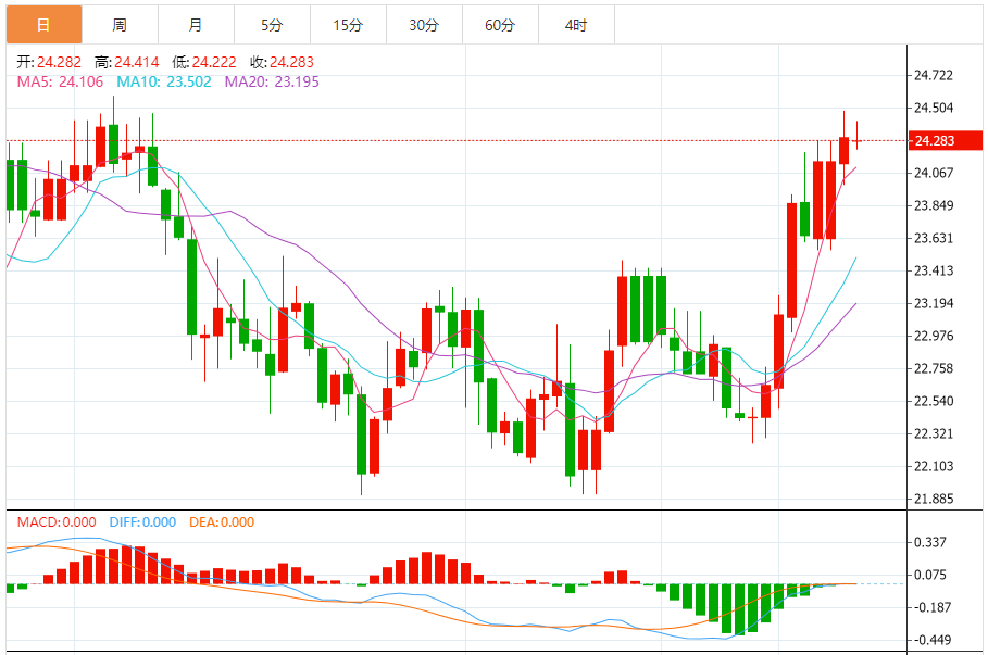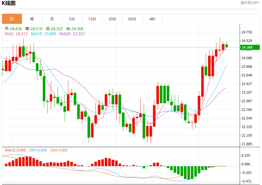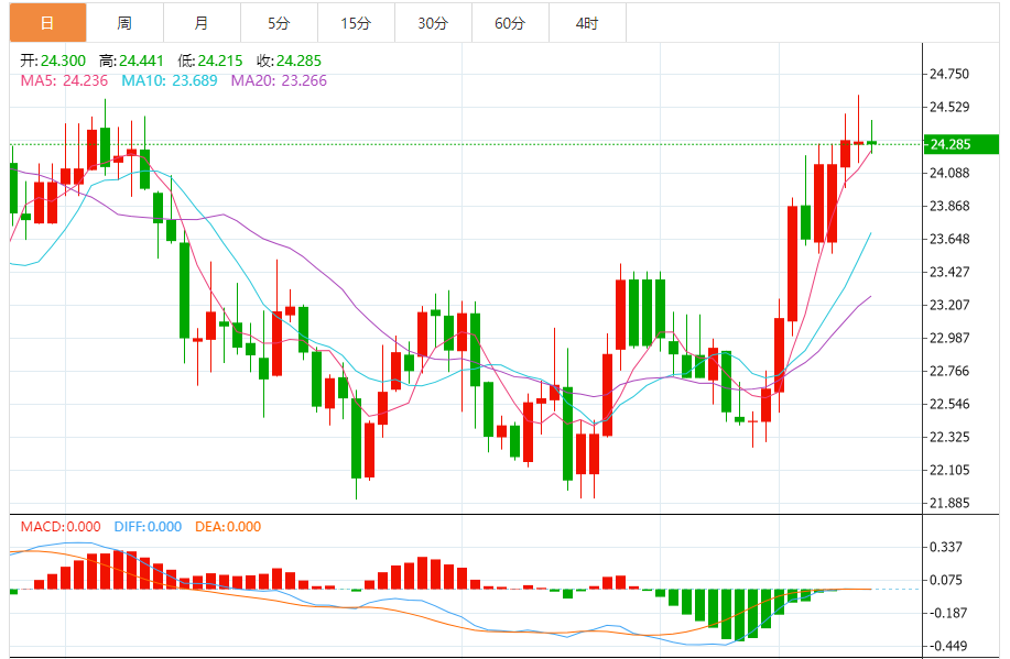 周四盘中,现货白银报24.290,涨幅0.60%。 今日分析:在23.90之上,看涨,目标价位为24.27,然后为24.40。 技术点评:RI技术指标运行趋势复杂,倾向于上升。 支撑位:23.9023.7023.55 阻力位:24.5524.4024.27 (亚汇网编辑:冰凡)