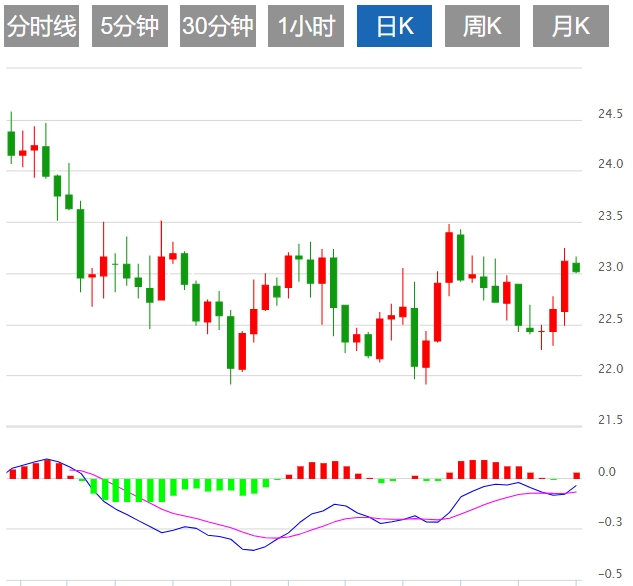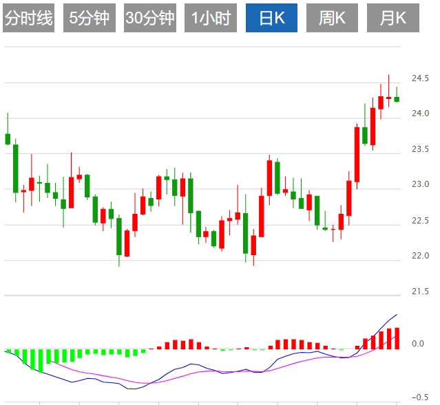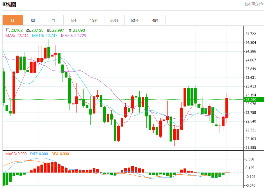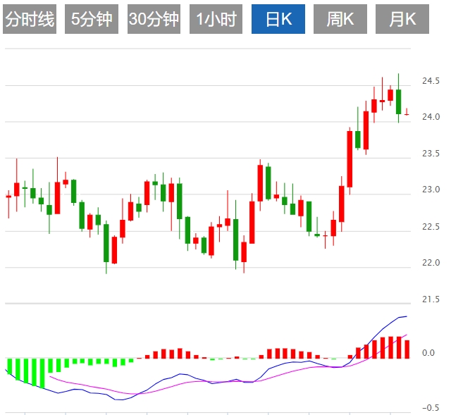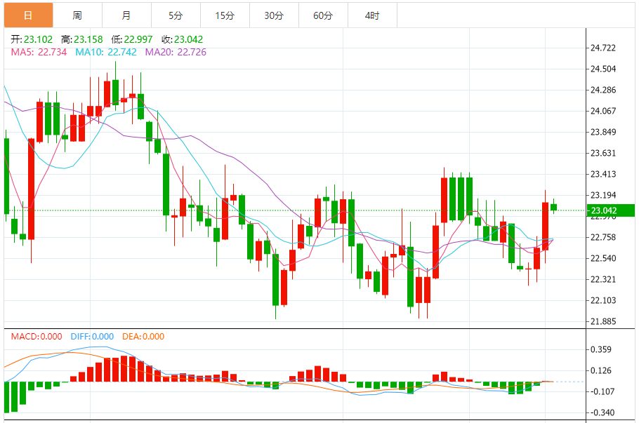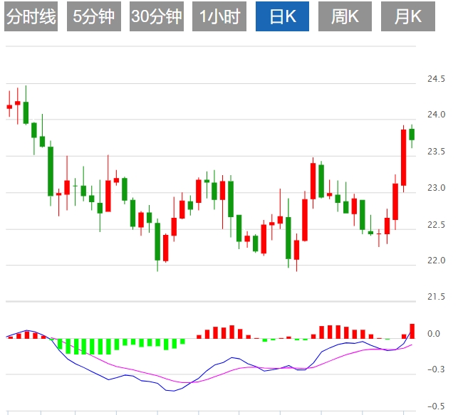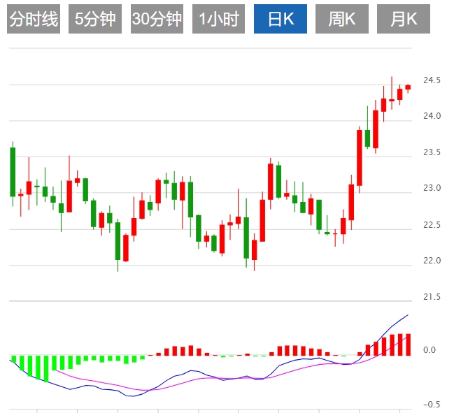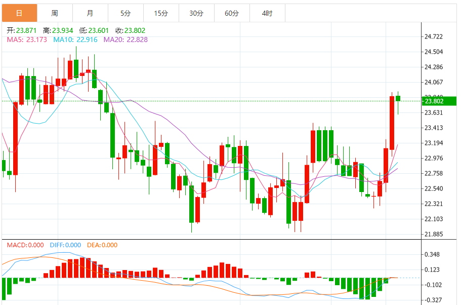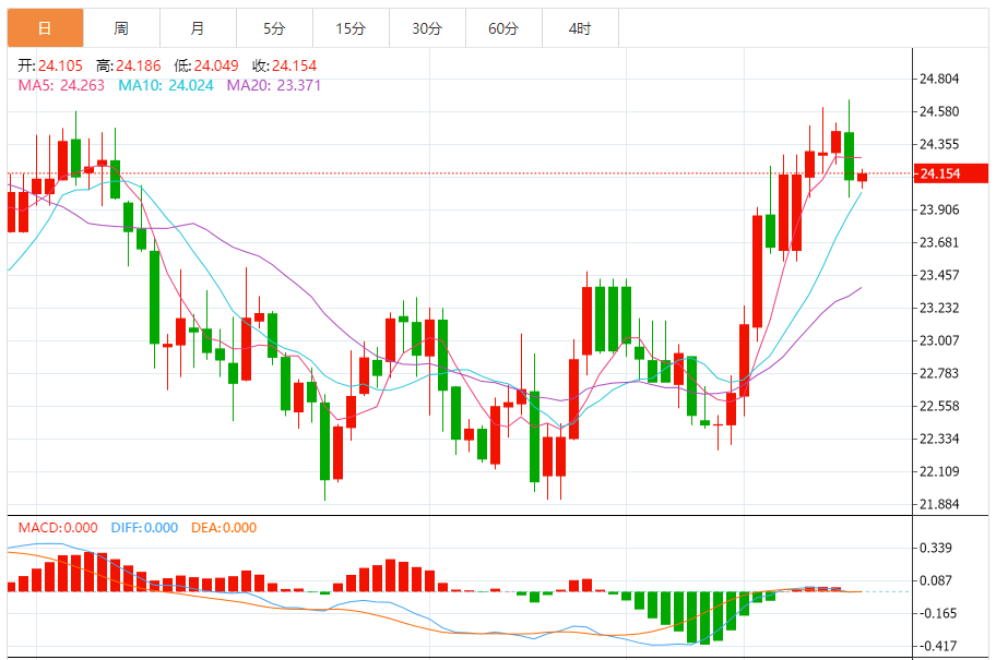 周四盘中,现货白银报24.290,涨幅0.60%。 今日分析:在23.90之上,看涨,目标价位为24.27,然后为24.40。 技术点评:RI技术指标运行趋势复杂,倾向于上升。 支撑位:23.9023.7023.55 阻力位:24.5524.4024.27 (亚汇网编辑:冰凡)