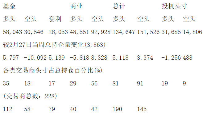 美国商品期货交易委员会(CFTC)最新公布截止3月5日当周COX白银期货和期权分类持仓报告: 合约单位:5000金衡盎司总持仓量:166332