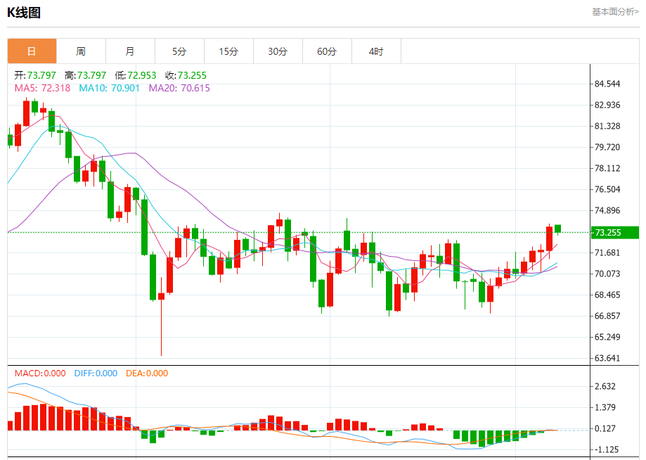 周一盘中,WTI原油报73.174,跌幅0.63%。 今日分析:在72.70之上,看涨,目标价位为74.00,然后为74.40。 技术点评:即使我们不能排除持续调整的可能性,其时间长度上,应该是有限的。 支撑位:72.7072.2571.45 阻力位:75.1074.4074.00 (亚汇网编辑:冰凡)