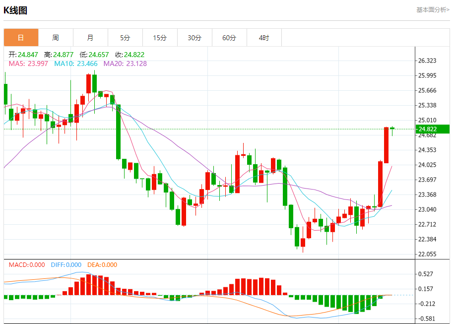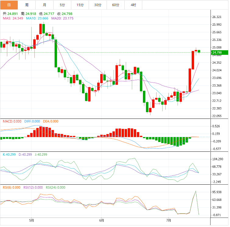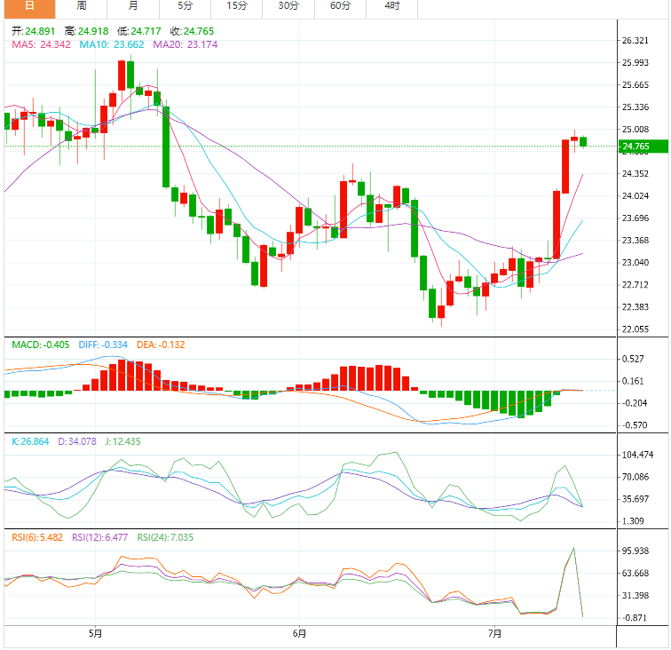 基本消息面 周五(7月14日)欧市盘中,现货白银在近期连续大涨之后小幅回落,银价目前位于24.80美元/盎司附近。根据conoi.co,银价已经确认突破看涨目标24.60美元/盎司,这为银价后市进一步上升铺平道路。 相关新闻消息 受美元重挫推动,现货白银周四收升3.13%,收报24.87美元/盎司。此前现货白银周三收市暴涨逾4