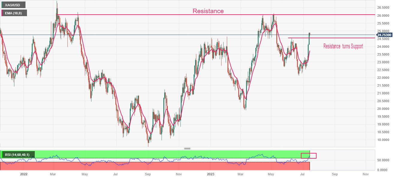 周二亚盘,现货白银交投于24.86附近,白银价格努力捍卫年度横向阻力转向支撑的上行突破。 市场基本面分析 交易商等待下周美联储会议提供有关货币紧缩路径的线索。利率期货显示,市场预计美联储将在7月25-26日会议再次升息,降息则要等到2024年。 美联储主席鲍威尔此前强调,大多数美联储官员认为需要再加息两次。在进