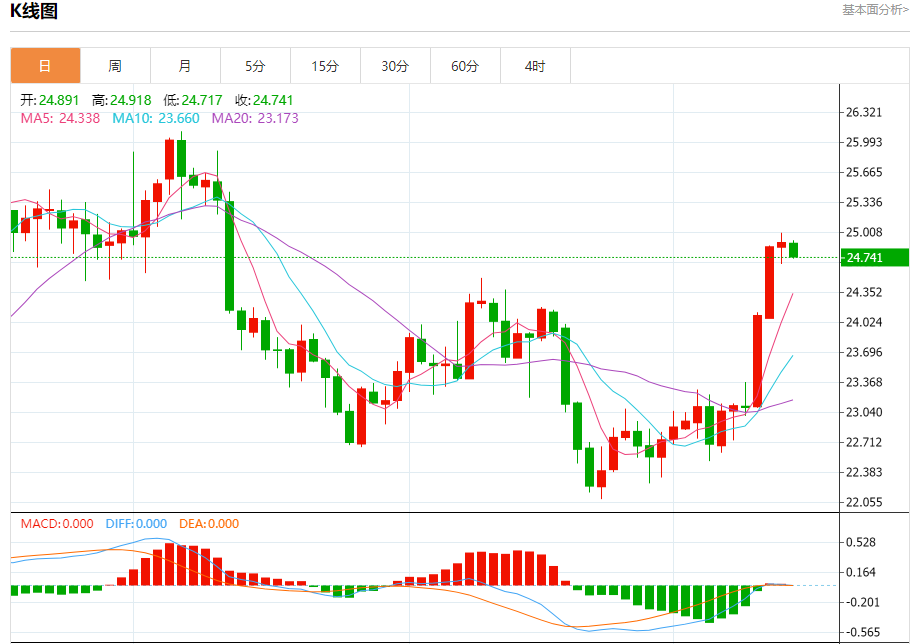 银价在新一周开始走弱,目前看来已经结束了连续三天的上涨,达到25.00美元的心理关口,这是上周五触及的5月11日以来的最高水平。周一欧洲市场,白银仍处于守势,目前位于24.75-24.80美元区域附近,日内下跌近0.70%,但任何有意义的下跌似乎都是难以捉摸的。 在近期银价从22.00美元附近反弹的背景下,上周五白银持续突破