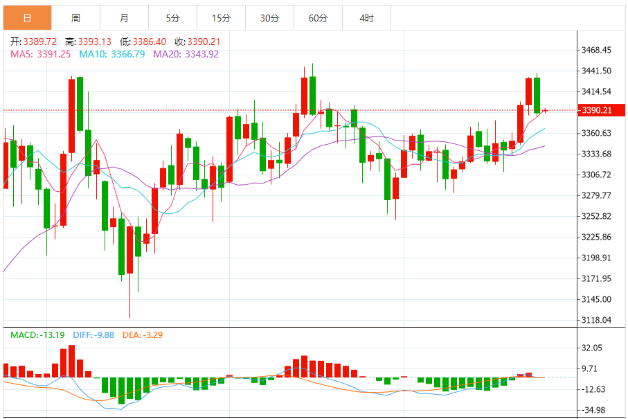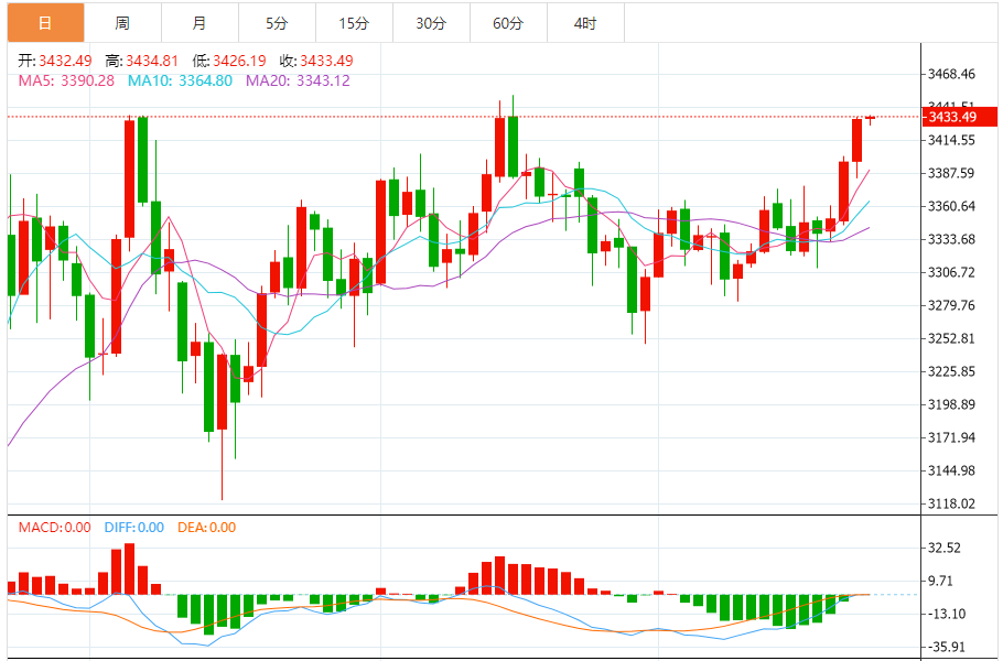 基本消息面 周二(7月22日)纽约尾盘,现货黄金涨0.94%,报3428.98美元/盎司,日内至北京时间21:00持续震荡于3400美元关口下方,20:00启动一波持续的上涨行情,00:00之前进入持续的高位横盘震荡状态,01:04刷新日高至3433.52美元。COX黄金期货涨1.02%,报3441.10美元/盎司,日内交投区间为3394.900-3447.50美