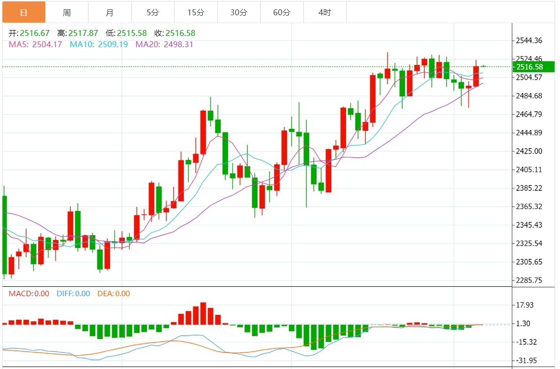 技术面来看,金价在布林线中轨附近获得支撑后再度走高,不仅收复了2500关口,而且该收复了5日均线和和10日均线,短线看涨信号有所增强,需要提防金价再度刷新历史高点的可能性。但MACD绿色柱仍在,金价仍留有高位震荡筑顶的可能性,需要提防金价冲高回落的可能性,分别关注10日均线2509.27和5日均线2504.33附近支撑。