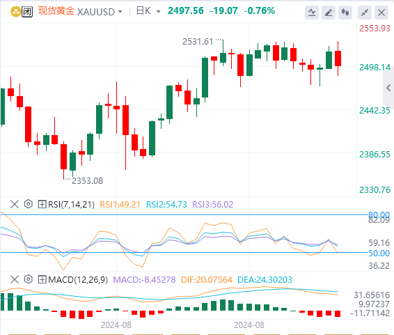 金价周五下跌,从盘中稍早触及的接近纪录高位的水平回落,此前公布的美国就业报告喜忧参半,令市场对美联储本月晚些时候降息的幅度产生怀疑。美国期金GCcv1收低0.7%,结算价报2,524.60美元。