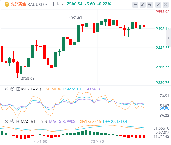 黄金正在窄幅区间内盘整,徘徊在2499.11美元的枢轴点上方。直接阻力位位于2511.34美元,进一步阻力位在2529.14美元和2542.28美元。