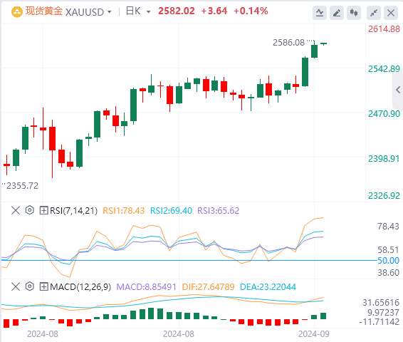在美国经济数据显示经济放缓后,市场对美联储降息的猜测不断升温,这提振了黄金,因为较低的利率降低了持有零收益资产金价机会成本。芝加哥商品交易所美联储观察工具显示,金融市场目前认为美国在即将于9月17-18日召开的会议上降息25个基点(bps)的机率为48%,而降息50个基点的机率为52%。