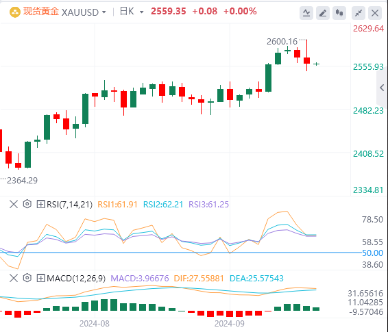 周三,现货黄金盘中一度冲上2600美元,续刷历史 新高,但随后急坠超50美元,截至目前,黄金报价2559.35。