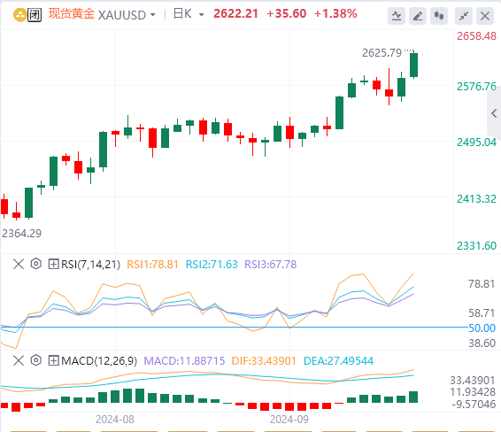 金价周五首次突破2600美元大关,延续了受美国进一步降息押注和中东紧张局势加剧提振的涨势。现货金上涨1.3%,报每盎司2620.63美元;美国期金上涨1.2%,结算价报2646.20美元。