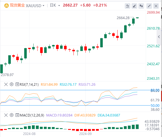 周二,现货黄金连续3日创下新高,盘中最高触及2664.28美元/盎司,截至目前,黄金报价2662.62。