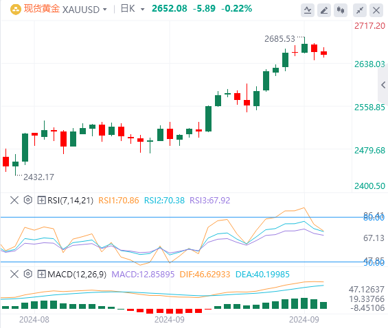 上周五,现货黄金创纪录涨势有所喘息,盘中最低 触及2643.05美元/盎司,最终收跌0.53%,报 2658.32美元/盎司,周线实现三连阳。截至目前,黄金报价2652.08