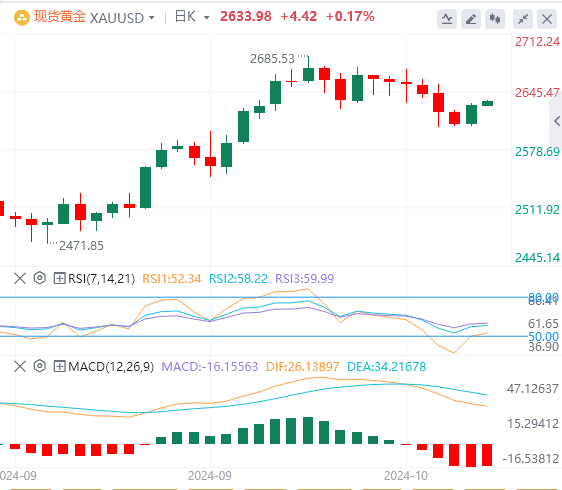 如果金价未能突破2650美元,其可能会再次跌向2600关口附近,该水平失守将下看50日简单移动平均线所在的2540美元。