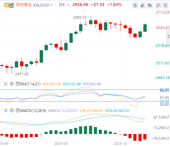 日图上的相对强弱指数(RSI)指标在本周早些时候下跌至中性的50区域后涨向60,表明黄金在经过技术修正后的看涨偏向依然完好。