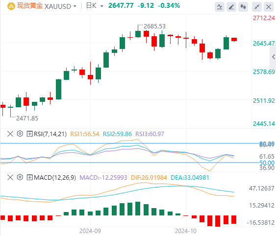 上周五,现货黄金涨逾1%,最高触及2661.37美元, 最终收涨1.04%,报2657.03美元/盎司。截至目前,黄金报价2647.77。
