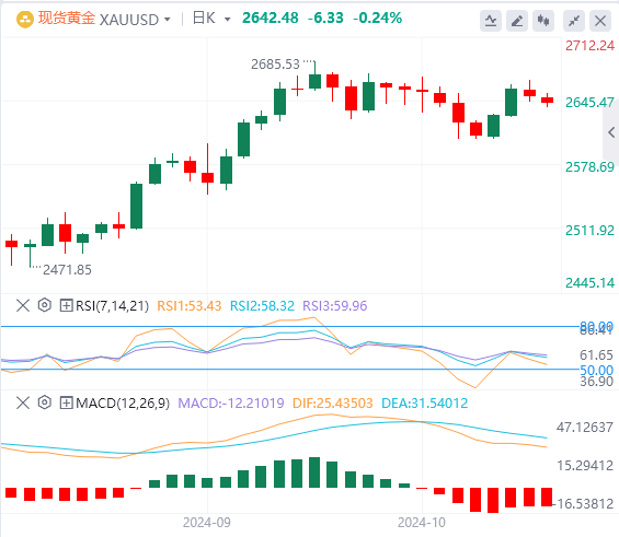此外,周末发布的中国财政刺激政策和疲软的通货膨胀数据令人失望,这几乎无法唤起投资者的信心。这成为削弱黄金价格并导致其下跌的另一个因素。尽管如此,中东地区持续冲突引发的地缘政治风险还是帮助避险贵金属止住了盘中跌势,并在周二亚洲时段持稳于2640美元水平上方。