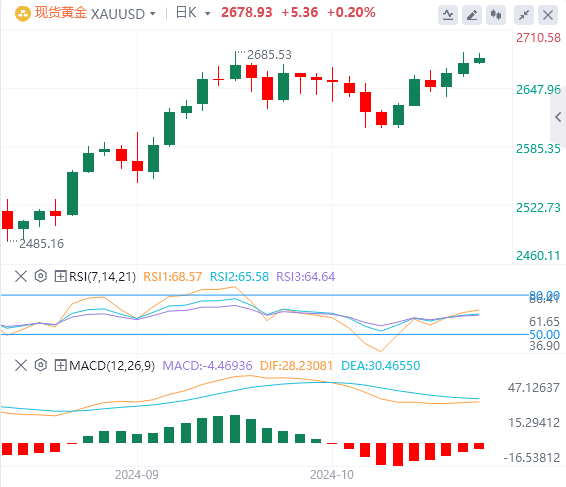 价格保持在关键枢轴点2666.86美元上方,表明看涨势头持续。如果黄金成功突破2685.60美元的直接阻力位,我们可能会看到金价进一步上涨,朝着下一个目标2697.75美元和2710.54美元迈进。